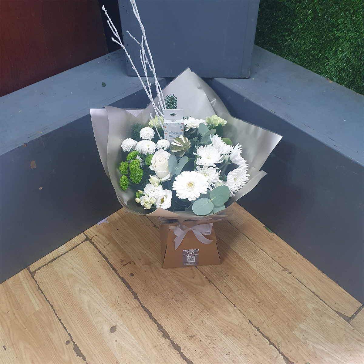 This flower bouquet consists of white roses, Gemini, deligreen, lizianthus, carnation, other beautiful blooms, seasonal foliages and fragrant eucalyptus. Finished in our luxury packaging including a box with water, and finished with decorative lime and frosted twigs.