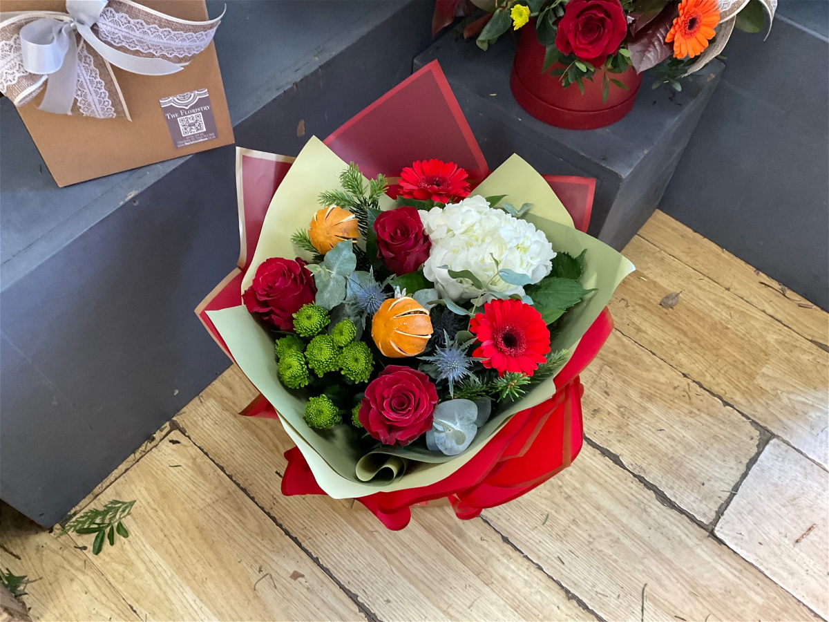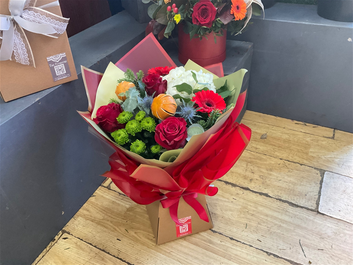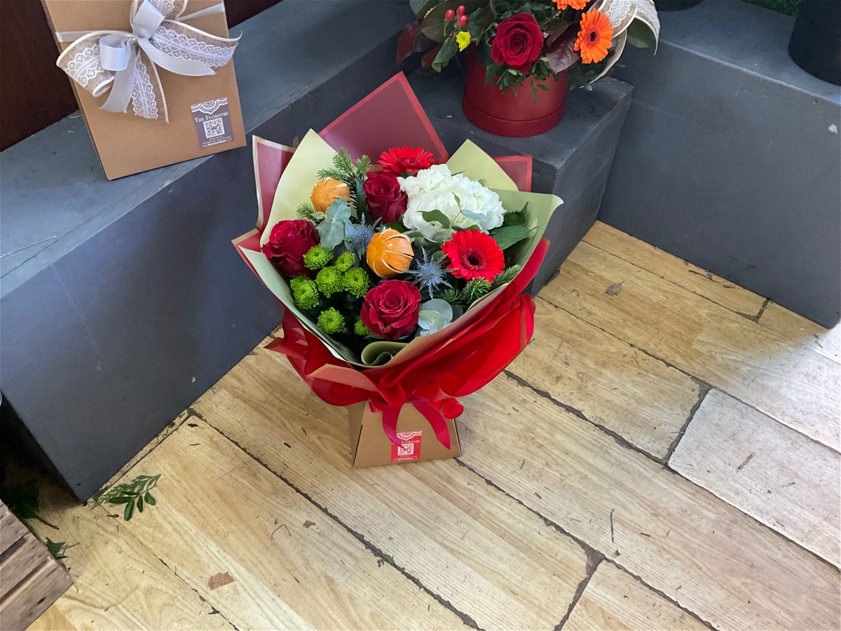 Luxury red roses, hydrangea, eryngium, gimini, deligreen, seasonal foliages and fragrant eucalyptus. This bouquet is presented in our luxury packaging including a box with water and seasonally decorated with clementines.